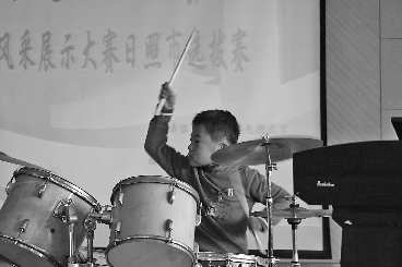 在28日上午举办的2010年度中国模范学生展示活动日照市选拔赛中,选手苗竣博正在表演爵士鼓。 本报记者 孔红星 摄