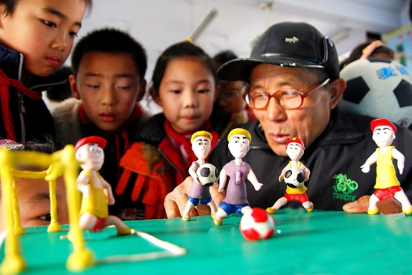 为迎接12月8日世界足球日,在泰前街道办事处御碑楼小学的面塑课堂上,民间面塑艺人范志勇教二年级的小学生将足球与面人相结合,制作出一组主题为《面人足球》的作品。图为学生们正在听范志勇讲解面人制作过程。