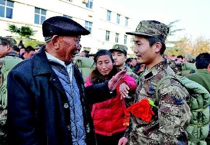 12月11日,87岁的抗美援朝老英雄王长海为刚刚穿上军装的孙子整理光荣花后,叮嘱他要争当一名优秀的军人。当日,枣庄市台儿庄区42名入伍新兵踏上征程,近万民众和学生前来欢送。