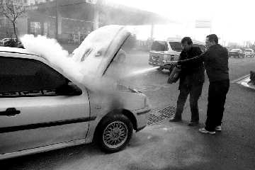 11日,在潍坊市福寿街白浪河东侧,车主正在用灭火器喷灭着火的汽车。据车主介绍,当时他开车从家出来,行至福寿街四平路路口时有人提醒他说汽车漏油了,车主将车停下后就发现着火了,着火后路边不远处的一个加油站工作人员拿来了4支灭火器才将火扑灭,由于扑灭及时并没有造成很大的损失,着火原因可能是油管漏油。