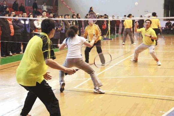 12月10日上午,由市委市直机关工作委员会主办的全市机关企事业单位首届羽毛球比赛在市公安局警官培训中心举行。比赛从10日至12日共为期三天,全市28支代表队参赛。图为混合双打比赛现场。 本报记者 李军 摄影报道