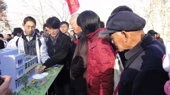 12月11日上午,聊城大学美术学院在人民公园举行主题为“走出校园,展示大学生风采”的大型书画作品展,展出作品120余件。图为:学生正在为市民讲解展出的一个建筑设计作品。本报记者 李军 通讯员 夏武萍 摄影报道