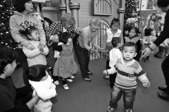 12日,在人民路一家超市,幼儿园的孩子与患自闭症的孩子一起做游戏。当日,这家超市为青岛聪明兔康复训练中心的孩子举行了关爱自闭症儿童的互动活动,并进行拍卖活动。
