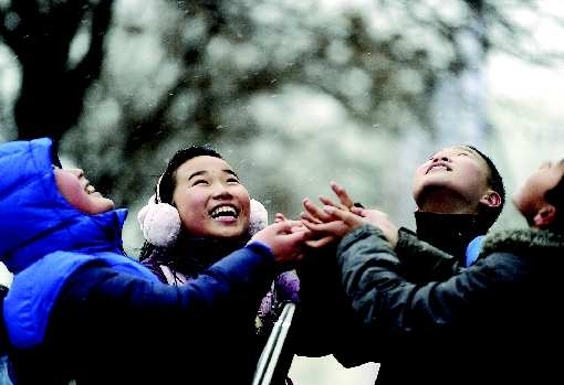 12月13日,济南迎来了入冬以来的第一场雪,虽然雪下得不大,但是姗姗来迟的雪花还是给市民们带来了惊喜和欢乐。泺源大街上,放学的孩子们快乐地用小手去迎接迟到的小雪花。