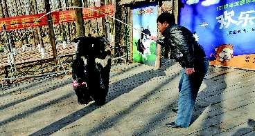 41岁的李彪来自安徽,最初在马戏团练杂技,17岁时在深圳接触到驯兽,“我从小就喜欢动物,于是从做驯兽师的助手做起,慢慢独自驯兽,成了一名驯兽师。”2007年4月,他来到日照国家海滨森林公园欢乐动物表演场,每年的“五一”到“十一”的旅游旺季,每天分四次表演两个小时。这里除了狗熊欢欢、乐乐,还有猴子、山羊、贵妇犬等动物。