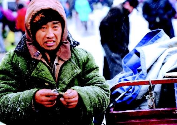 虽然白雪纷飞,但为了养家糊口,张师傅依旧得在红利市场坚守蔬菜摊位。 本报记者 郭建政 摄