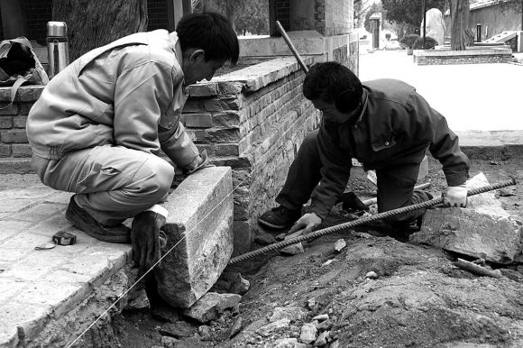 15日,施工人员在岱庙内正在修葺路沿石,重新铺设道路。据了解,经过两个多月的施工,岱庙内游客步行道多数得到整修。