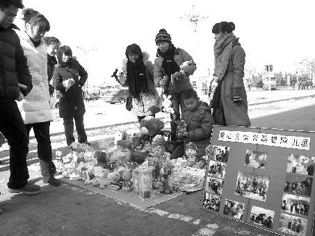 18日中午12时,4名市民在石油大学北门摆出地摊卖毛绒玩具,旁边还放着一块“爱心义卖资助智障儿童”展板,引来不少人驻足。其中一位负责人告诉记者,她们是石油电力管理总公司的员工,有7人参加这项活动,筹集的善款将于元旦前捐给东营爱心园的智障儿童。