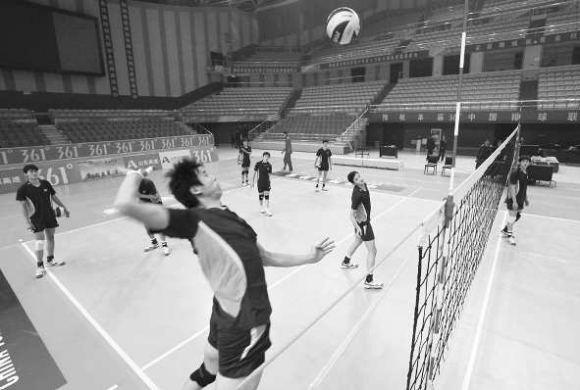 22日下午3时,在聊城体育馆,山东高速男子排球俱乐部的18名队员正在适应场地训练,备战25日下午4时,在聊城体育馆举行的中国男子排球联赛(2010-2011)山东-四川的比赛。