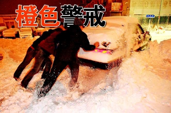 30日清晨,几名市民合力将困在积雪中的汽车推出。本报记者 赵金阳 摄■道路结冰橙色预警■部分小学停课一天■数千城管凌晨清雪■蔬菜海鲜供应充足详见C03-C05关注