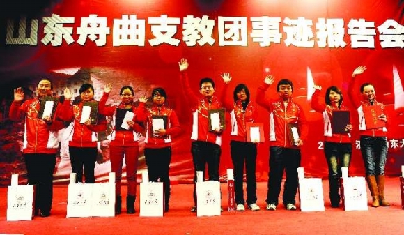 8日上午,山东舟曲支教团事迹报告会在山东大学中心校区科学会堂举行。九名支教志愿者被共青团山东省委、齐鲁晚报共同授予“山东省舟曲支教优秀志愿者”荣誉称号,同时九人被聘为“齐鲁晚报荣誉读者”。“如果有机会,一定回舟曲!”这是报告会上志愿者们说得最多的一句话。图为九名志愿者在台上向大家挥手致意。 本报记者 周青先 摄