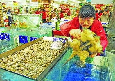 “这叫鳄鱼龟,体重约5斤,是前几天从济南海鲜市场上进来的货。”水产专区的张老板说,“目前售价为148元/斤,这是人工养殖的,肉质非常好,以前我们卖过,有的消费者就认这个。”“这个东西从来没见过,我可不敢吃。”围观的崔先生说。一旁的刘先生则对鳄鱼龟比较感兴趣,并不时用手挑逗它。