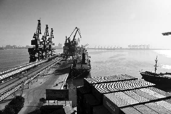 12日,日照港的集装箱码头和远处的散粮码头。
