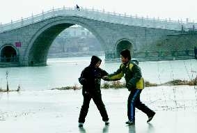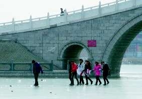 在东升桥附近的东昌湖上,也有很多市民对“禁止溜冰”的提示牌视而不见,横穿大片结冰的湖面。几名放学的小学生在冰面上跑来跑去,还不时嬉戏打闹,让人看了捏一把汗。