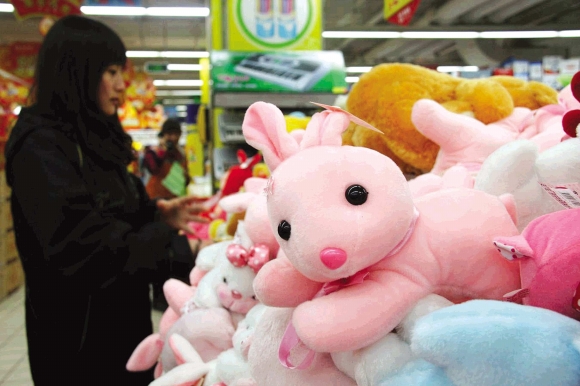 16日,在财源街一家超市,市民挑选造型逼真的毛绒兔玩偶。距兔年只剩半个月时间,各种造型的兔玩偶已经大量上市,并摆在货架明显位置。