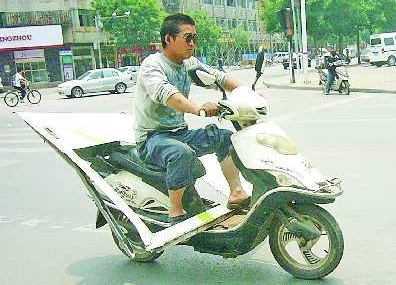 自述:一男子骑着电动车带着一扇大铁门。