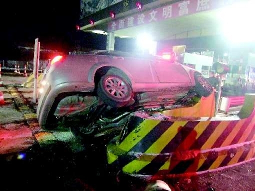1月16日18时30分,驾驶员崔某驾驶别克轿车自烟台返回威海。车辆行至荣乌高速莱山轸格庄收费站处时,由于速度过快,崔某采取制动措施不当,轿车冲到收费站的安全岛上,受损严重,但未造成人员伤亡。图为事发现场。