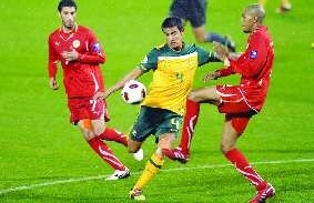 1月18日,澳大利亚球员提·卡希尔(中)在比赛中争抢。当日,在多哈举行的2011亚洲杯足球赛C组比赛中,澳大利亚队以1:0战胜巴林队。 新华社发