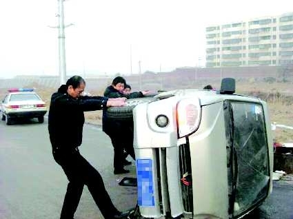 1月18日7时许,招远市公安局张星派出所民警在经过国大公司门口时,发现一辆小型面包车侧翻在路边,两个中年人正在从车里往外拖东西。民警立即下车询问并帮助将车扶起。