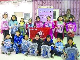自从在报纸上看到“一个书包一份爱,1万个‘孔子书包’捐赠贫困学子”的公益活动后,雏鹰小队的15名小学生便把贫困地区的小伙伴记在了心里。刚放寒假,孩子们就来到位于二环东路的孔子文化大厦现场认捐,自发组织了这次爱心行动。