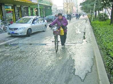 24日下午,济宁市城区洸河路新事故广场南侧,人行道上的花砖缝隙间不断往外渗水,由于天气寒冷,结了一层厚厚的冰,在自行车道上形成了一条70多米长的“冰带”,给附近居民和来往的行人带来了不便。据附近居民介绍,此处渗水已经有两三天,天气冷就结成了冰,很多路过的行人滑倒,比较危险,希望有关部门赶快维修。本报见习记者 胡洋洋 摄