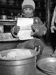 西西翁姆脸上泛着高原红,红红的小脸蛋儿有些皴裂。黑黑的小手摸起来热乎乎的,有着和她年龄不符的粗糙。她的话不多,接过威海热心读者捐赠的200元善款后,西西翁姆低着头,说了声,“谢谢!”