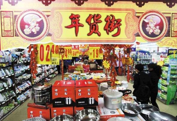 1月24日,在柳园路一家超市内,用红灯笼、鞭炮、福字装饰的百米长的“年货一条街”上,各种商品琳琅满目,多项促销活动吸引市民购买,红红火火迎春节。本报记者 李军 摄