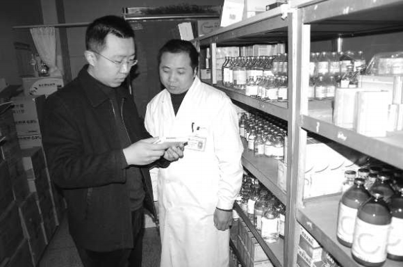 春节临近,市药监局执法人员加大对制售假劣药品等违法行为的打击力度,防止假劣药品流入市场,22日,执法人员在市区一家医院药房内检查。本报通讯员赵长青 摄