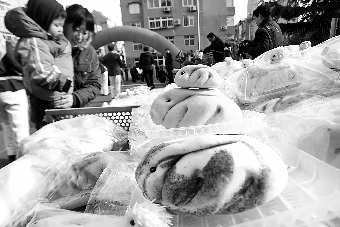 1月25日上午10时,在湛山社区广场,社区居民正在挑选各种卡花馒头和带有兔型图案的枣饽饽馒头,一家企业做了一百个兔子造型的馒头供市民挑选。当日,湛山“丰福乐杯”卡花民俗文化艺术节正式开幕,居民可以现场购买到卡花馒头、手写的春联和手工剪纸,不走出社区就能够感受到浓浓的年味。 本报记者 杨宁 摄