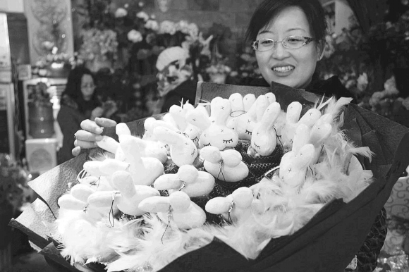 14日,在文化路一家鲜花店,店主展示刚包装完的以兔子装饰做成的“花束”。