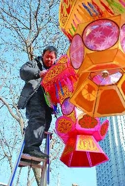 2月15日,市中区大观园街道办事处的工作人员正在紧张地进行花灯布展。济南市中区花灯展于2月15日—17日在万达广场展出,此次花灯会还将穿插民间民俗扮玩表演。 实习生 刘敏 摄