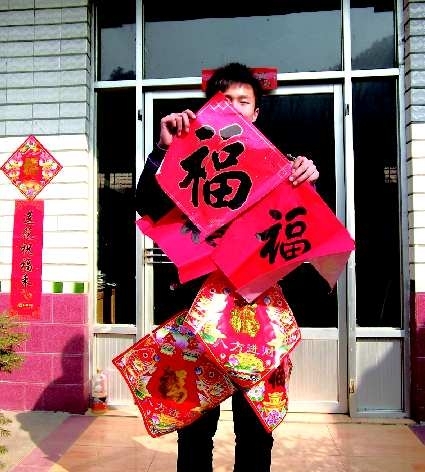 拍摄时间:1月30日拍摄地点:济南长清作品描述:为了图个吉祥如意的“福”气,这人全身披挂,让红火火的“福”字贴满了全身。相机型号:富士JX255作者:马洪利奖金:30元