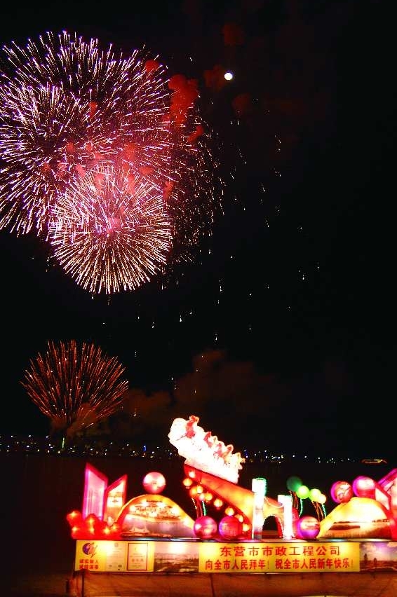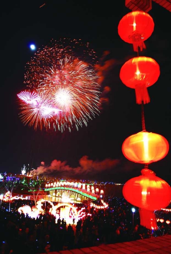 2.清风湖烟花与大型灯组相映成趣。 本报见习记者 段学虎 摄