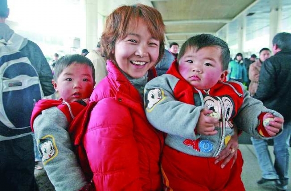 2月18日,济南长途汽车总站候车大厅里,双胞胎姐妹王亚茹和王欣茹跟随母亲一起等待开往郑州的班车。当日是农历正月十六,按照传统风俗,大批务工人员在刚刚过完元宵节后,集中踏上外出务工的旅途。 本报记者 王鸿光 摄