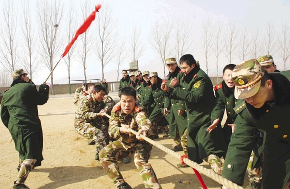 15日,为冬季训练成果的转化,进一步提高军事素质,武警泰安市支队在教导队举办了第二届军事体育运动会,11个单项第一名的成绩记入支队军事体育运动会纪录。图为武警官兵在拔河比赛中。