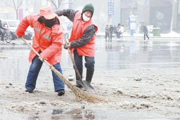 当天,城区环卫工全员上路除雪,从凌晨5点多一直干到下午1点多,十分辛苦。本报记者 李军 摄