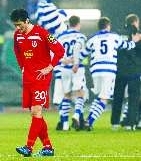 当地时间3月1日,杜伊斯堡队球员庆祝进球,科特布斯队球员邵佳一(左一)低头走过。当日,在杜伊斯堡进行的德国杯半决赛中,科特布斯队客场以1:2不敌杜伊斯堡队,遭淘汰。 新华社 供图