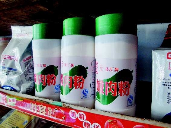 记者走进一家规模较大的食品添加剂专营店。当得知记者要买“嫩肉粉”,店主从地上一堆箱子里翻出了一个小瓶子递过来说:“这就是。”