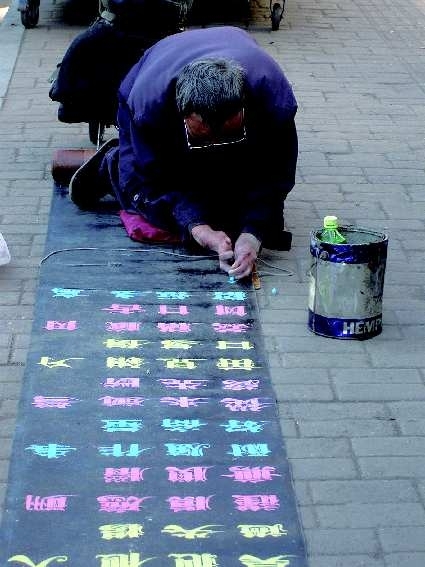 本报3月2日讯(见习记者 张娜 熊戈措 实习生黄浦)烟台市汽车总站对面的街道上最近出现了一位特别的卖艺男子。记者见到他时,他戴着一副大墨镜挡住面目全非的脸,正努力地用扭曲变形的双手夹着粉笔在黑色条幅上写书法。