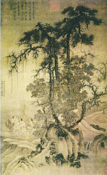 置身在静谧而萧瑟的山间,看古树槎桠,泉溪淙淙,却不是放浪于山水,醉心于风景,而是肩荷着劳作的工具,谨慎地走在崎岖的小路上。画中的人物,不正是唐棣真实心态的展露?