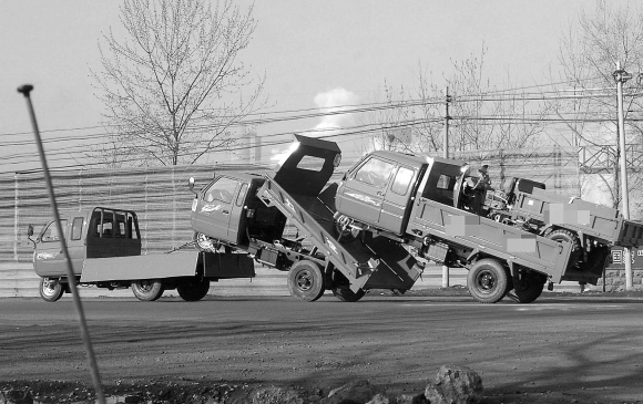 7日,一辆崭新的无牌三轮车沿104国道自北向南行驶,在这辆三轮车后面,还拖着另外两辆三轮车。而最后一辆三轮车倾斜的车斗上,还停放着一辆小三轮。