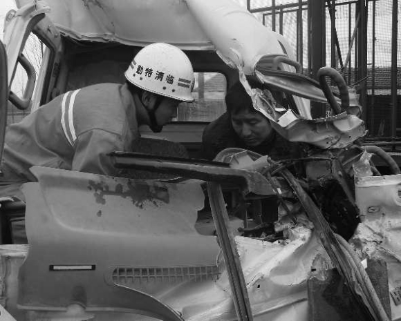 3月6日下午,临博路临清康庄镇路段,一辆轻卡车与一辆拉麦秸的农用车追尾,轻卡车司机被死死卡在驾驶室里。临清公安消防中队迅速赶到现场,10分钟内救出被困司机。图为:消防战士施救前稳定被困司机情绪。