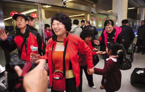3月14日晚6时52分,在青岛流亭国际机场,刚刚从日本返回青岛的郑先生一家开心地走出机场出口,脸上流露出幸福的笑容。日本地震发生后,在日逗留的青岛游客受到了岛城人的广泛关注。3月14日,在日本逗留5天后,山东省国旅青岛分社共39人的旅游团平安返回青岛。