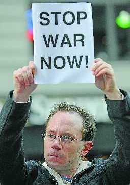3月19日一名男子在美国纽约时报广场 参加反战集会 新华社发