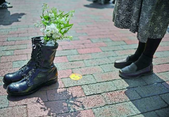 ▲3月19日,在美国首都华盛顿举行的反战示威集会上,死亡的美军士兵的靴子被摆放在白宫前。 新华/法新