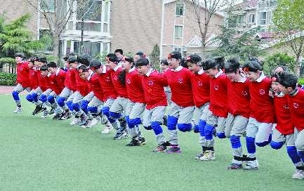 4月10日下午,济南外国语学校开元国际分校举办了“团结一心,冲冲冲”绑腿跑比赛决赛,通过1个多月的训练比赛,增加了同学们的凝聚力和协调力。图为获得四年级组亚军的四年级八班的同学们在奋力冲向终点。本报记者 李飞 摄