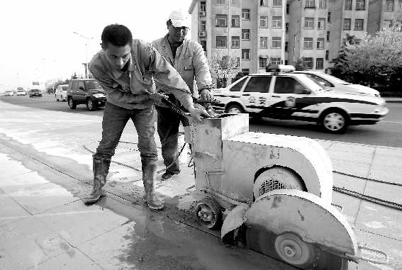 当日下午,记者在施工现场看到,施工人员用切割机已经在人行道上切出了长长的“分割线”。