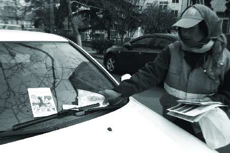 14日下午,在逍遥三路上,环卫工人将刚刚插在车上的广告宣传页收走。据了解,接孩子放学的家长将私家车停在逍遥三路上,每天都能收到很多关于培训、兴趣班、投资等宣传页,不少家长看到后直接随手一扔。为了便于打扫,宣传页刚插到车上环卫工人就开始清理。本报记者 杨宁 摄影报道