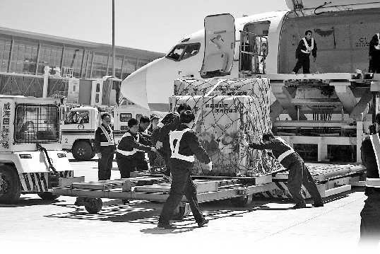 在飞行约2小时30分后,运载台湾同胞赠送的梅花鹿“繁星”“点点”和长鬃山羊“喜羊羊”“乐羊羊”的货运包机,缓缓降落在山东威海大水泊机场。飞机停稳后,工作人员将箱子稳稳地送到摆渡车上。来自台湾的4只宝贝生平第一次踏上大陆的土地。 本报记者 侯书楠 摄