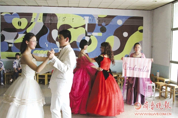 26日,博文中学举行第三届校园英语节,通过排练英语短剧表演,营造浓厚的学习英语氛围,提高学生的英语水平。图为初二年级四班学生在表演英语短剧《灰姑娘》。